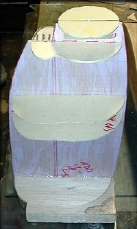 You can see that the keel and formers are "poking out" of the surface. That's intentional, since the formers were cut with an allowance for 1/8" of surface buildup. After the second fill coat and fiberglassing, the surface will expand beyond the formers. |