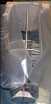 The next number you need is the wing chord, at the centerline point of the nacelles, which you can get from the top view. With this number in hand, I printed out two items. First, I plotted an airfoil of the appropriate chord. Next, I printed out two copies of the side view of the nacelle. On my original drawings, I had already made a point of showing the airfoil incidence relative to both the inboard and outboard edges of the nacelles, so finding the incidence of the "nacelle center" airfoil was easy. Finally, I cut out the airfoil shape from the nacelle side views, so I could slip them onto the wing. I glued these nacelle keels to some 1/8" balsa, cut them out, and then glued some tabs to the bottom of each piece, making sure that they were identical. When you slip them onto the wing. they look like the image below. Don't glue anything yet!