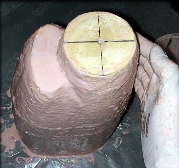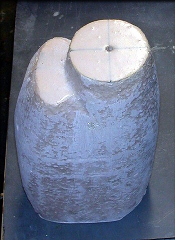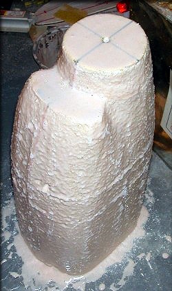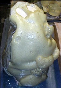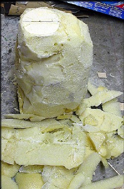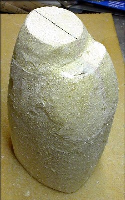 After the foam was poured into the cowling form, (See below) and allowed to overflow, this is what you have. Although this looks horrible, remember... it's only foam, and very easy to carve and sand. I always let these things sit overnight, to be sure it's fully cured. You'll hear it "crackle" occasionally. When it stops crackling for at least a couple of hours, it's done. |