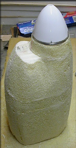 To make the cowling plug, I used a method that's worked well for me in the past, using a mix-and-pour urethan foam to create the basic shape. The advantage, aside from speed and ease of use, is that it makes the plugs very durable... more so than a wooden frame with planking. These will be glassed afterward, further improving their durability. I'll wait until the first cowling is actually molded, before making the inlet duct, to insure a perfect fit.