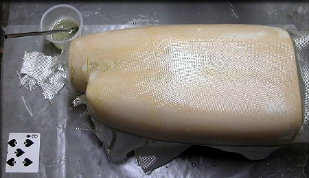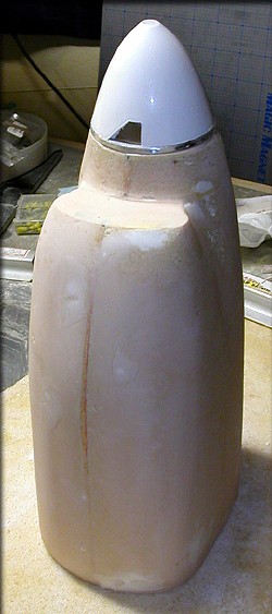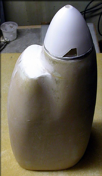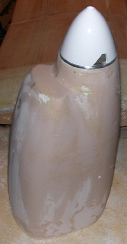 After the glass was cured on both halves of the cowling plug, I trimmed the edges, and applied a thick paste of epoxy and microballoons to the seams and to the spinner/intake area.