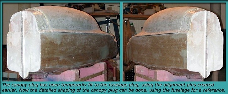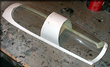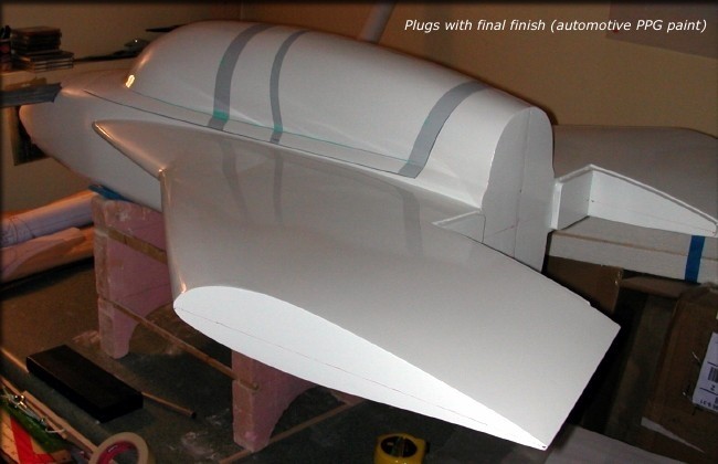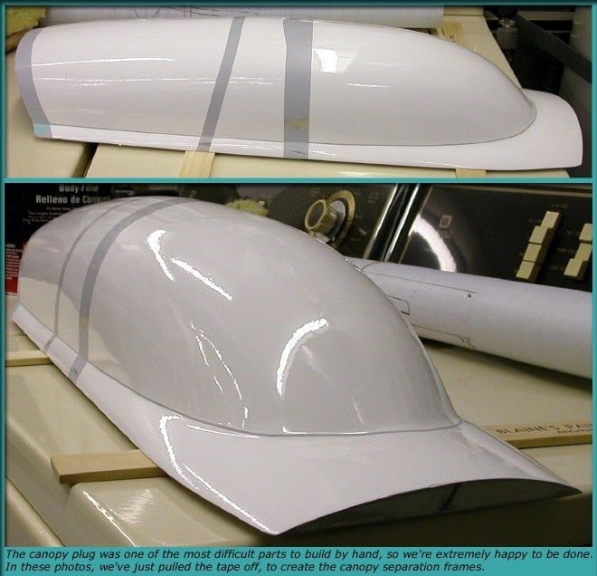 The idea was to create a plug which would be used to fabricate a composite canopy, as well as a vacuum-formed clear canopy. Since both parts would be made from the same plug, a good fit of the (optional) clear parts of the canopy into the composite frame would be assured. If you do this, be sure that your final surface coat is something that can take the heat and pressure of vacuum-forming, without outgassing. I discovered that the PPG automotive paint used for the final surface coat is not suitable for this purpose, and that a lacquer-based primer is better.