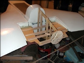 A simple wooden frame was used to insure aligment of the (4") spinner backplate, based on the actual drawn plans. I had patterns I could use as external templates to check the shape, so a lot of detail wasn't required in this frame. In this case, the engine was supposed to have two degrees of upthrust, so the frame insured that the spinner backplate was at that angle.