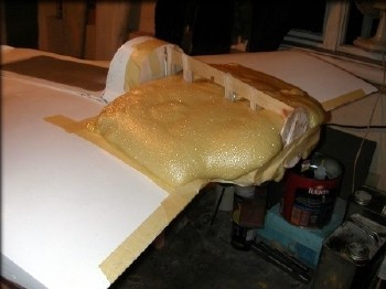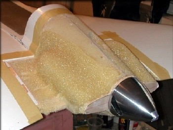 First, the perimeter of the cowling area was taped off with masking tape, then 2-part urethane foam was poured into the form. The foam won't stick permanently to the waxed fuselage plug, so this isn't as scary as it looks. As it turned out, I was careful enough that no foam went past my masking tape boundary, and no foam got on the fuselage plug anyway.