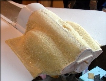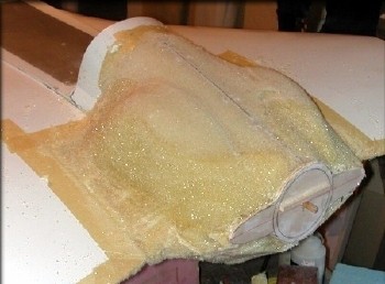 First "sealer coat" to toughen up the foam, was a thick mixture of epoxy and phenolic micro balloons. This stuff is a lot easier to sand than glass micro balloons. Once this was cured, the whole plug was removed from the fuselage for shaping. As shaping was going on, I could re-attach the plug to the fuselage, to check the fit every once in a while.