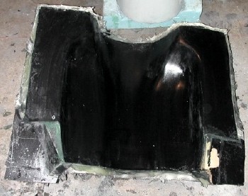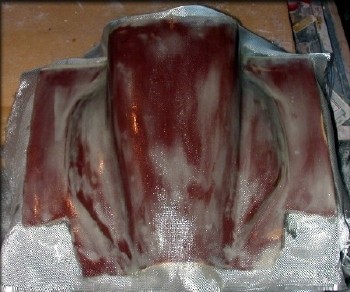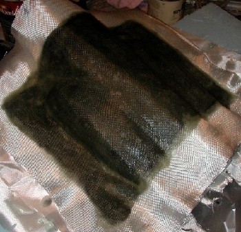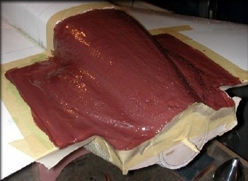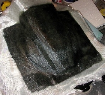 Same layup method as the first half of the mold. Take your time, and try to remove as many air bubbles as possible, by carefully "burnishing" the cloth down with a stippling motion of the brush.
