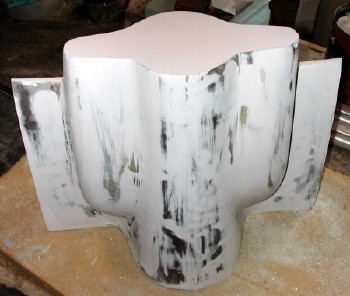 Finally done, the plug is inserted into the parting board, waxed, and given a coat of PVA, in preparation for making the first mold half.