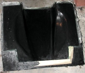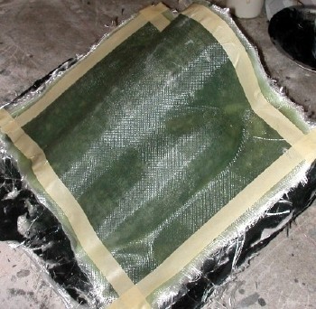 After the tooling resin had tacked in a little, several layers of 3.5 oz cloth were added, then many layers of heavy (6 oz.) cloth were added, to build up the mold thickness to about 1/4 inch.