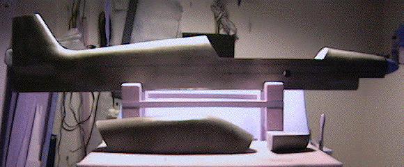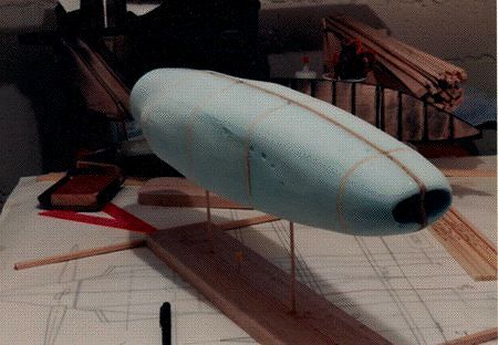 Here's another way to make a plug Cut a center keel, add some formers, then glue in some oversize foam blocks to fit between the formers. Then simply sand the foam back down to the surface of the formers, and glass it. This is the engine nacelle plug for my 1/6th scale "Avanti" project, before glassing.