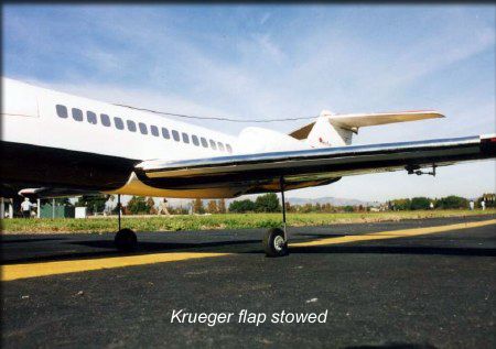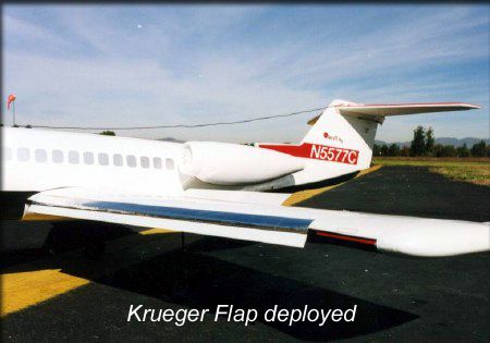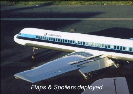 I Modified a Great Planes Lear Jet with a leading edge Krueger flap and a "lift dump" spoiler set. Simple drop flaps. Other plane is a DC 9-52 series with Fowler flap. (Two sets of spoilers) Both lift dumpers at altitude or on landing. When spoilers are cleanly configured outboard spoiler moves up and augments roll with aileron . Plane also served as a test bed for a ventral speed-brake like that on a Fokker 100. Plane also has custom made o-ringed wheel brakes. One of them is also a Great Planes kit fitted with logo lights, landing lights, wheel well lights, Ice lights, full interior light, nav lights. strobe. Simple drop flaps and custom wheel brakes.