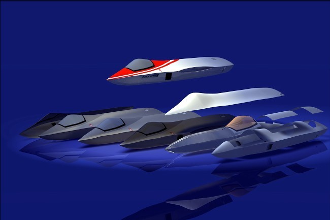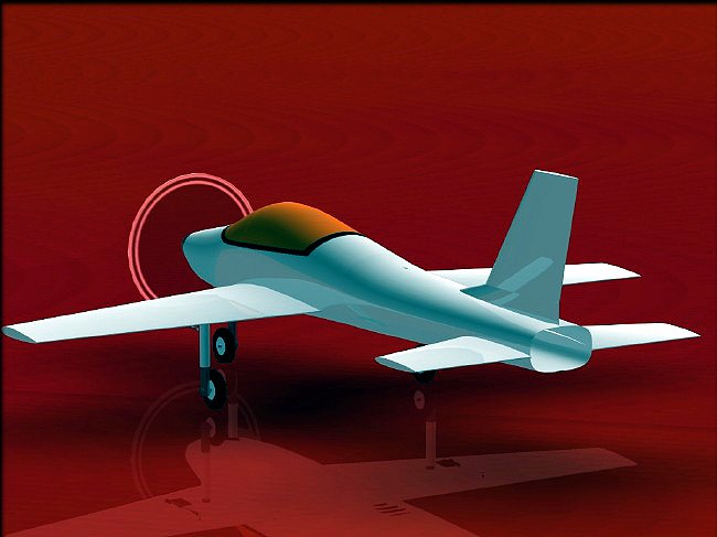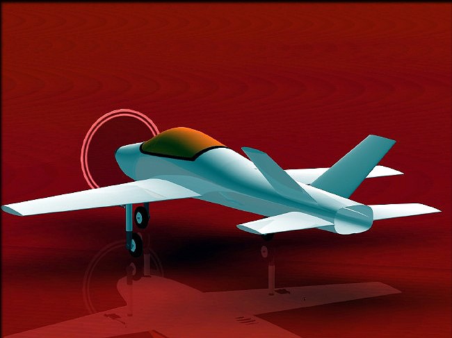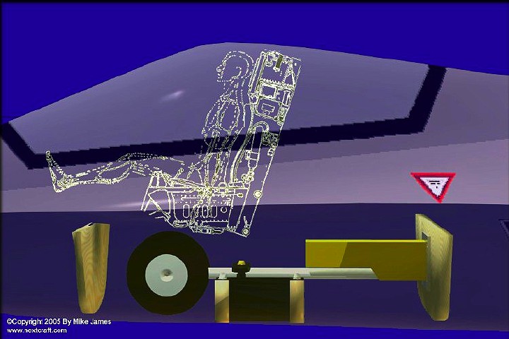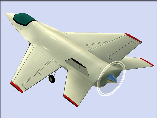 Another early decision was to eliminate any sort of jet intakes, since they would only add drag, and not be functional. So, the sides of the fuselage are a continuous curve, from the nose to the tail, and the "intakes" you see are simply painted-on graphics.