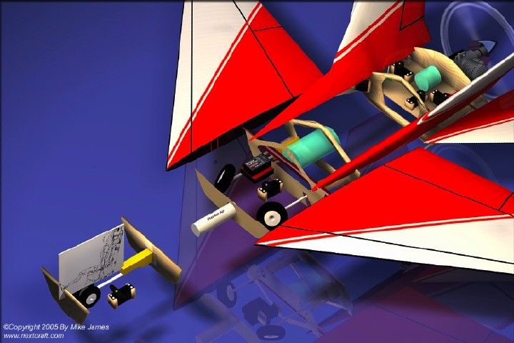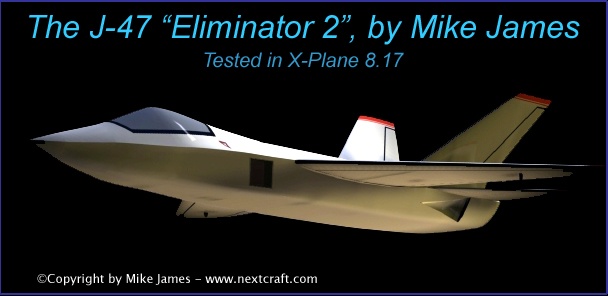 For a movie of the "Eliminator 2" flying, recorded in X-Plane, click the image above. Takeoff from Meigs Field in Chicago, quick climb, some rolls, knife-edge flight, then onto approach, with flaps and leading edge flaps depolyed. (about 16.4 MB)