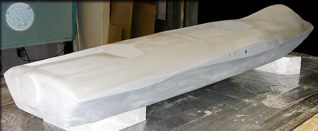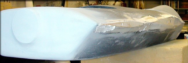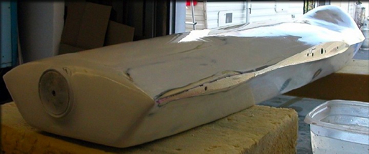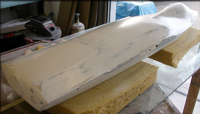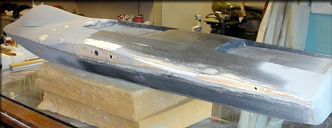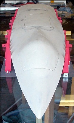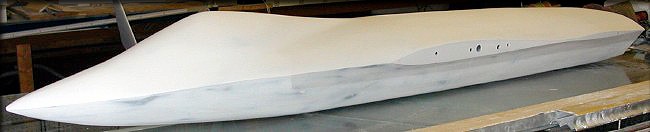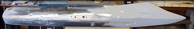 Hatch plugs and canopy plug attached, the last bits of filler are added, while aligning the chine.