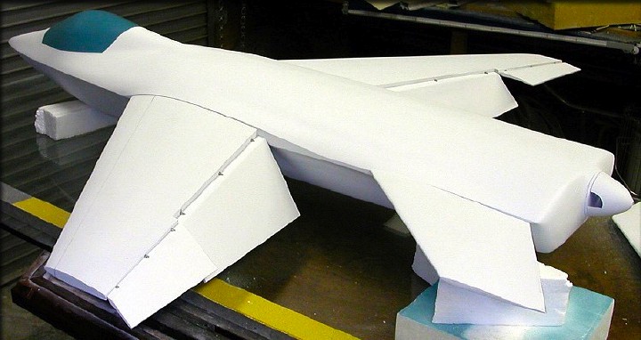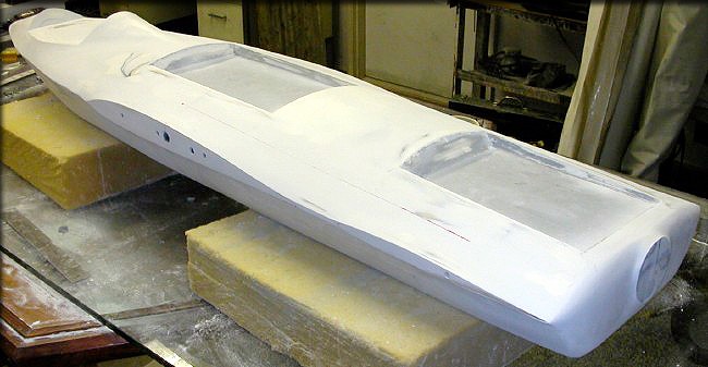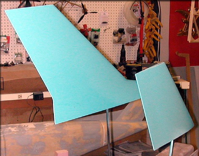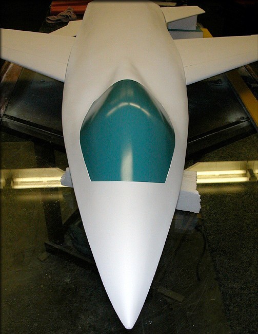 Tail surfaces and canopy plug were given a coat of engine enamel, as the final pre-mold finish.