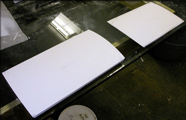 The seam was adequately hidden, so in that regard, this test was a success. The seam was technically right "at" the edge, so some careful sanding of the flashing produced a medium-grade part. This test piece was molded especially lightly, to see what was required, using only 2 layers of 2 oz. cloth, along with a bit of Cabosil to form a fillet around the inside of the seam. It weighs 2 ounces, painted. That's very light. But, it was easily twisted, and when deformed, would either crease, or break the seam at the floor. I decided that this wasn't good enough, and tried a different approach, below. The surface area for this part, excluding the frame, is about 100 square inches.
