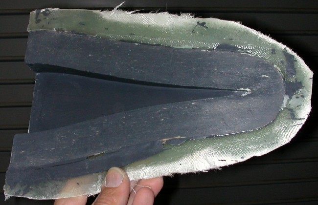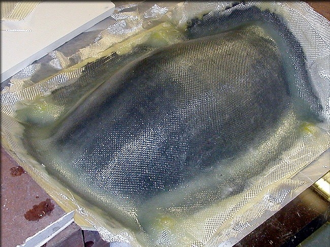 This piece weighs 3 oz., done by hand. I'll eliminate 1 layer of the 2 oz. cloth, if not both, and also reduce the overall resin, when I vacuum bag this part in production. Even without creating more lightening holes, this part will be as light as it's predecessor, but MUCH stronger. This piece is extremely rigid, and cannot be twisted until a severe force strong enough to break it, is applied.
