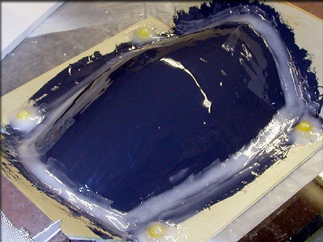 I glued 4 nylon "inserts" to the parting board, to create female alignment holes in this mold half. (the yellow things) Next, a layer of epoxy/cabosil was filleted into all the sharp edges, so the cloth would conform more easily. Again, this was allowed to tack in for about an hour, so that when I added the cloth, it wouldn't move around.