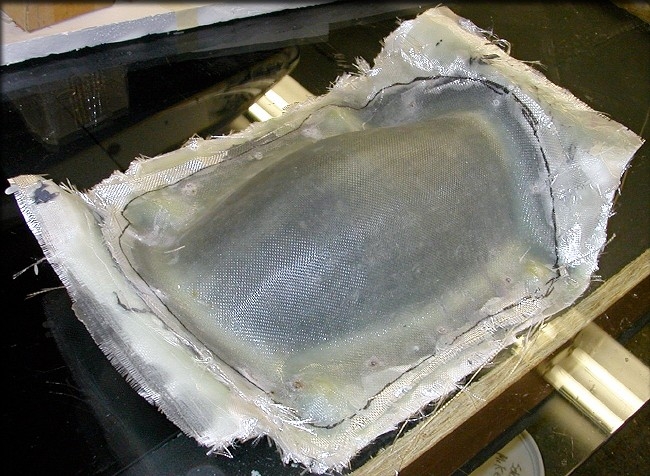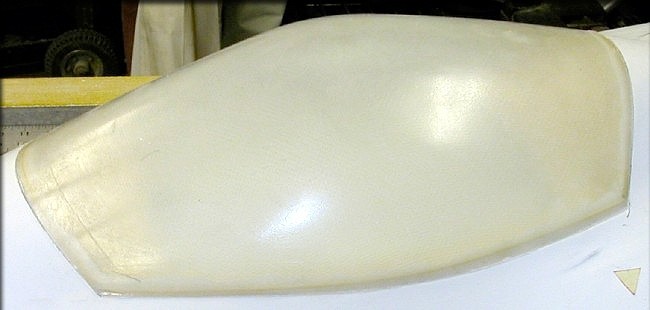 When I applied the cloth to the "floor" or bottom part of the canopy mold, I did NOT trim it properly to the recessed trim line I created, but just let it hang over the sides. The result of this was fairly serious, The entire canopy floor was actually then "outside" the perimeter at the 3 edges, (front, bottom, and rear) which increased it's size, dimensionally. This made the canopy impossible to fit, because it was simply too tall.