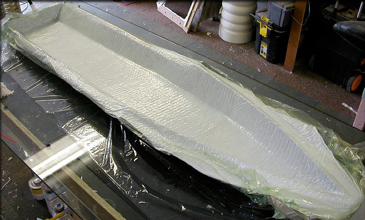 It's always been my intention to make the first fuselage a test piece, to be sliced up, for verifying former shapes. I'm making this one heavy, so it won't buckle when sliced. It's several layers of 6 oz. cloth. (fuselage bottom shown here)