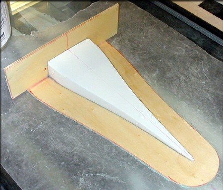The procedure below could be used any time you want to make a simple one-piece female mold. Here, I've made a male plug for a NACA inlet, and are going to make a female mold. (There will be an inlet-shaped cutout in the fuselage, and the piece that comes out of this mold goes on the inside of the fuselage.) Since the molded parts will be epoxied or siliconed to the inside ot the fuselage, I've intentionally created a flange with a rough surface. Later, this will create a better bond for the glue. Our parting board was made of 1/8" plywood. For your reference, this plug is about 8 inches long.