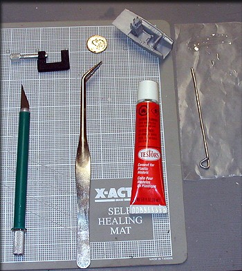 After building so many large RC models lately, I was reminded just how small some of these parts can be. Take a look at the cockpit assembly above, next to a dime, for scale reference. I use tweezers to handle small parts, some very small X-Acto clamps to hold parts in place, and I use a piece of piano wire to apply glue to parts. (Toothpicks work well for that too.) First, I squeeze a drop or two of glue onto the scrap of waxed paper, then I use the wire to actually pick up and apply the glue. It's almost always a mistake to try and squeeze glue from the tube itself.