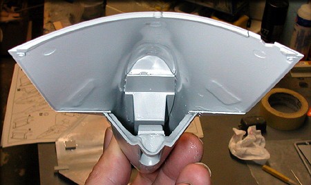 If you're going to build a scale RC model of a plane like this, you'll begin to see two things... First, notice how much space the interior items take up, and where that space is taken up. Second, notice how the openings in the fuselage (the side that's against the work table, in this photo) affect the structural integrity. You may as well give some thought now as to where spars and landing gear mounts need to go. A nice feature of this kit is that it includes separately-molded ailerons and flaps, so you can see where trailing edges and hinges should go. Of course, if you're using ducted fan or turbine power, then you have to consider ducting too.