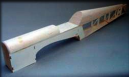 The wing is extremely light, built from truss-style, rather than sheet ribs, and is also very nicely covered, with the servo mounting rails already installed. I later learned several impressive things about the quality of the factory building process. All the balsa is contest grade and very light. The model is factory-assembled in a jig, (by workers who fly airplanes!) using wood glue instead of CA, and is completely dried in the jig before removal. This gives you a very strong, light, and neat-looking structure. I inspected all the glue joints that I could, and found no weak points. The fuselage is designed to have the rudder and elevator servos mounted in the tail, and those mounts are installed too. Blind nuts for the wing bolts were already installed in a secure plywood plate, and integrated with the fuselage sides. As an added bonus, there are some nice crisp red and white "FasCal" markings included on several separate sheets.